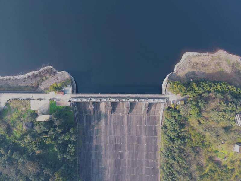 垂直俯瞰,狮子滩水电大坝溢洪闸孔道整齐,蔚为壮观。安徽财经大学叶朋憬/摄